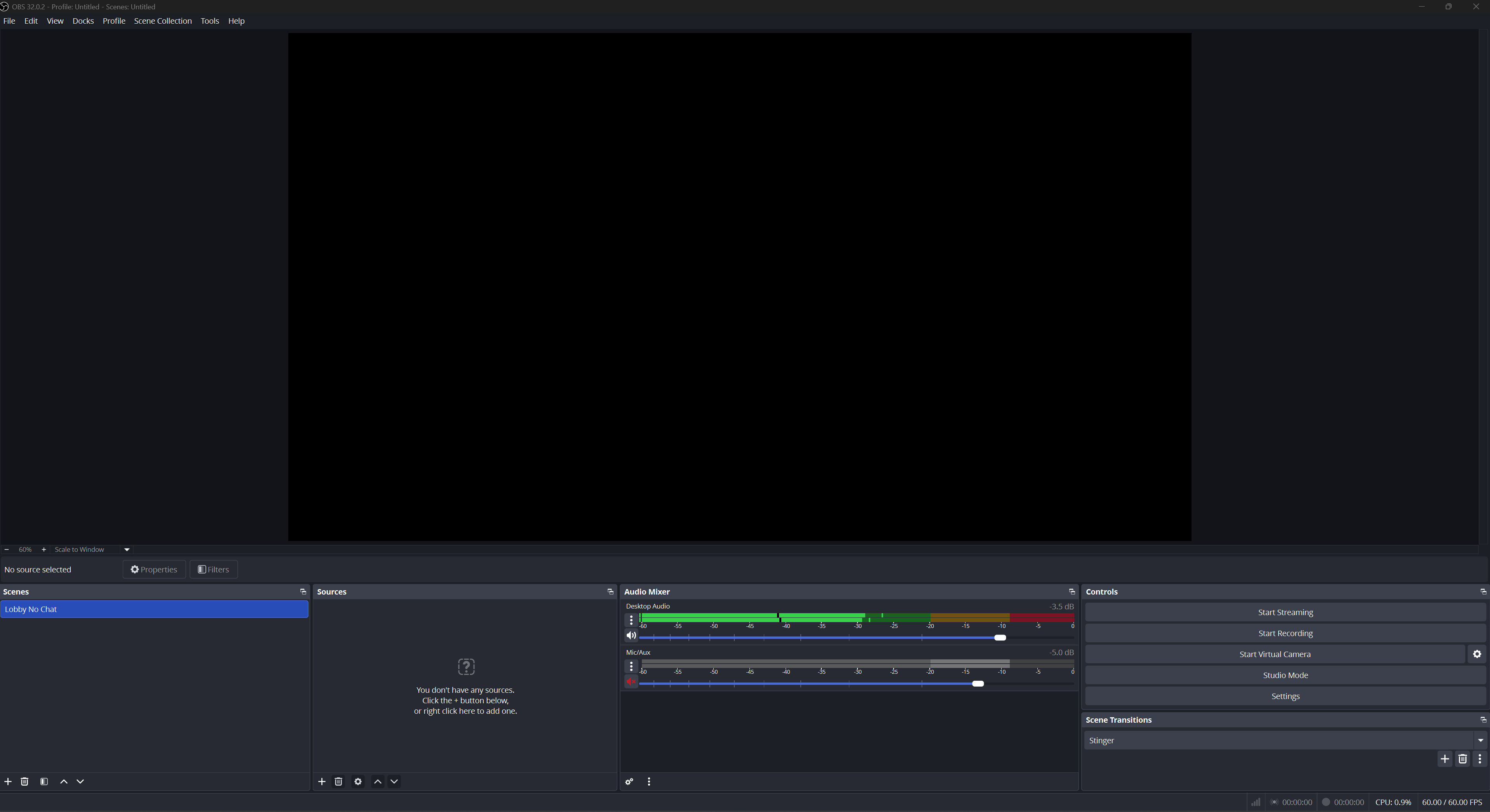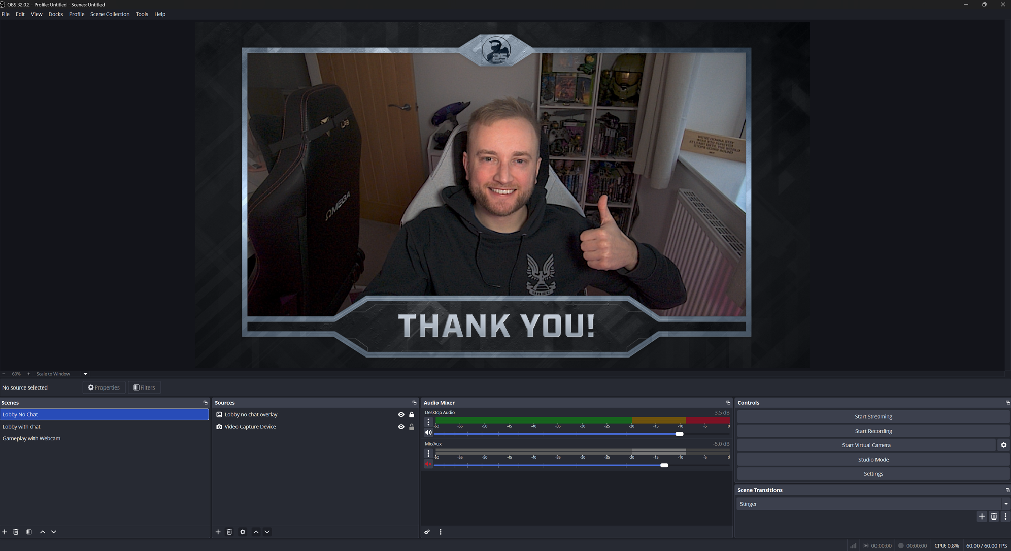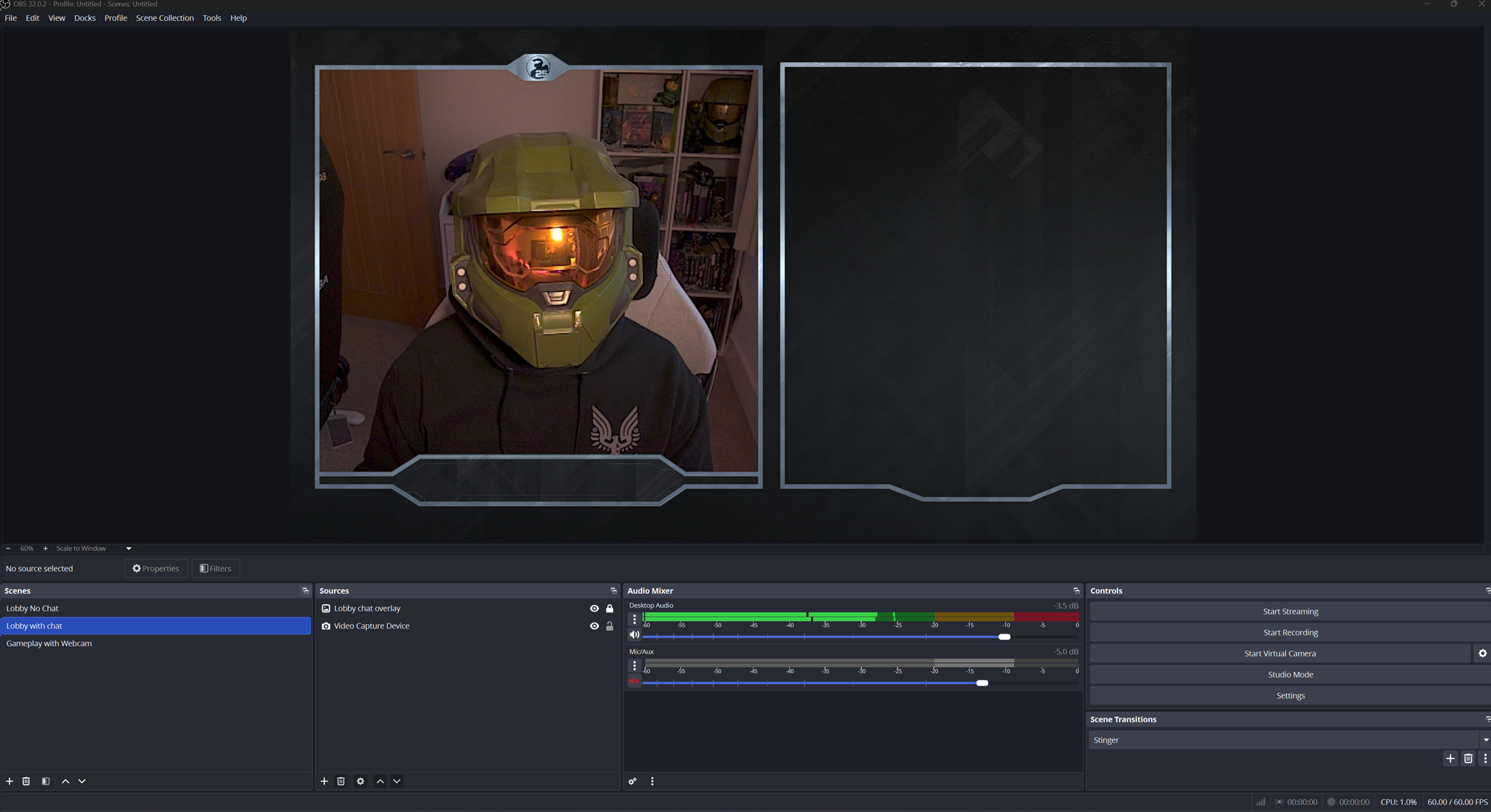 Now that you’re acquainted with the basics of OBS Studio, we’re going to cover how to set up a lobby scene complete with a chat feed. Much like before, you’ll first insert a webcam-output element and then upload an image file containing your lobby and chat overlay.