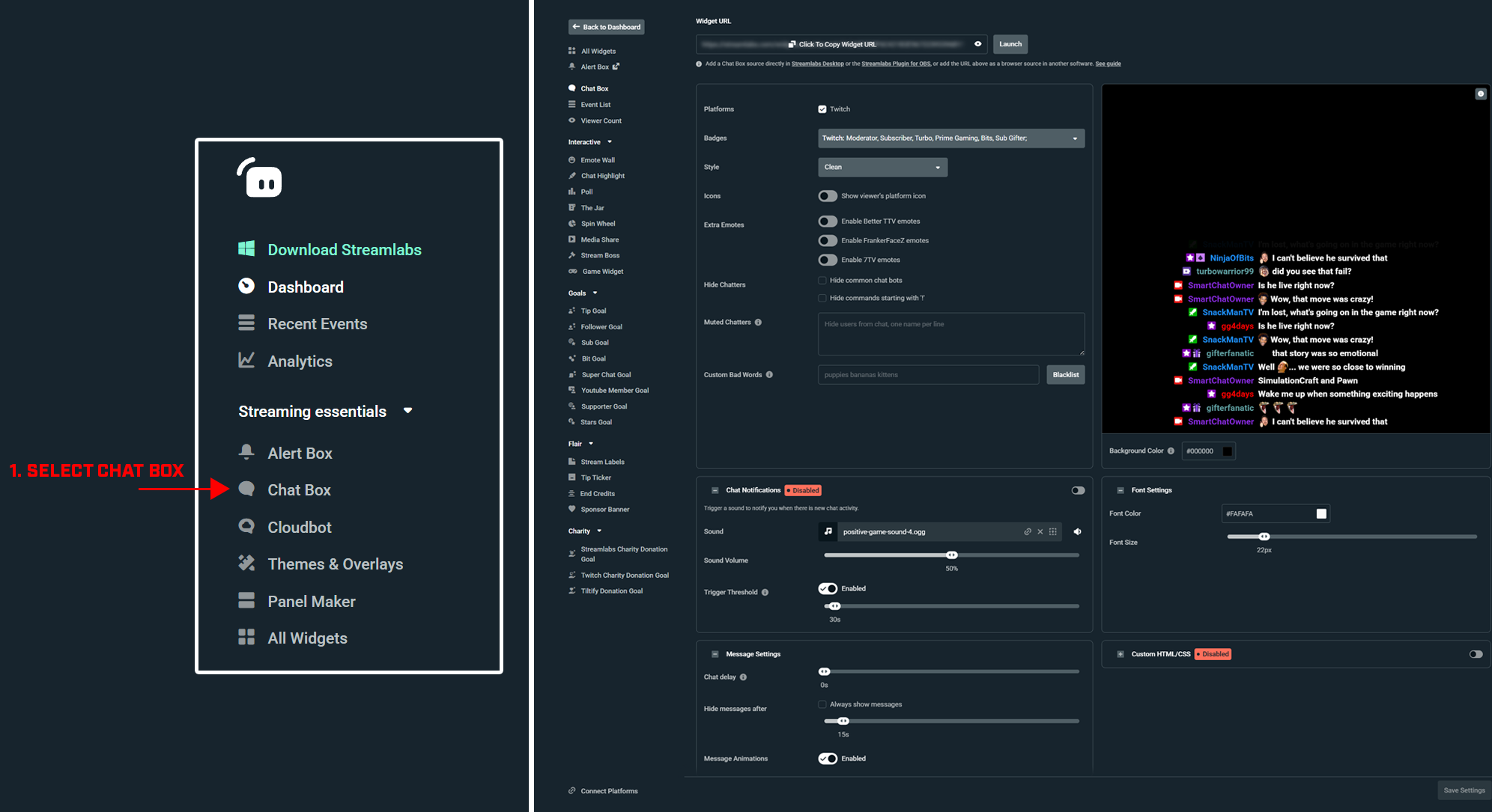 To configure your chat feed to appear in your new scene, return to the Streamlabs dashboard and select the “Chat Box” option.
