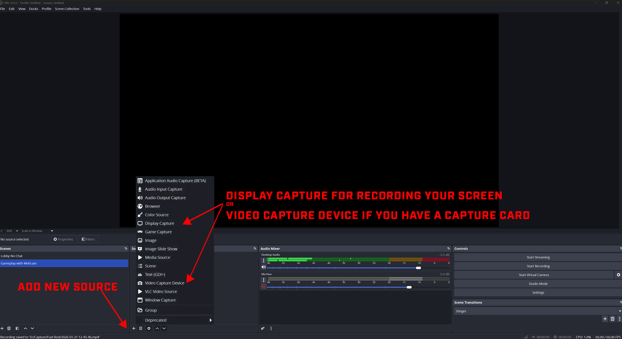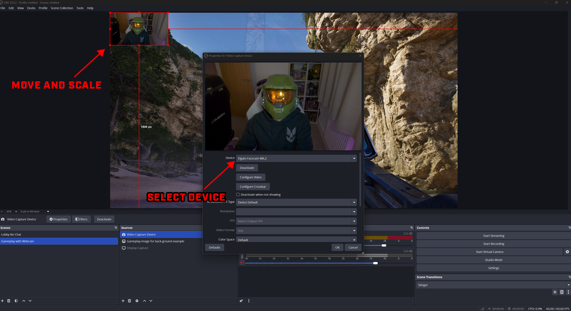 To capture gameplay, you’ll first need to create a "Scene” and set up your video devices.