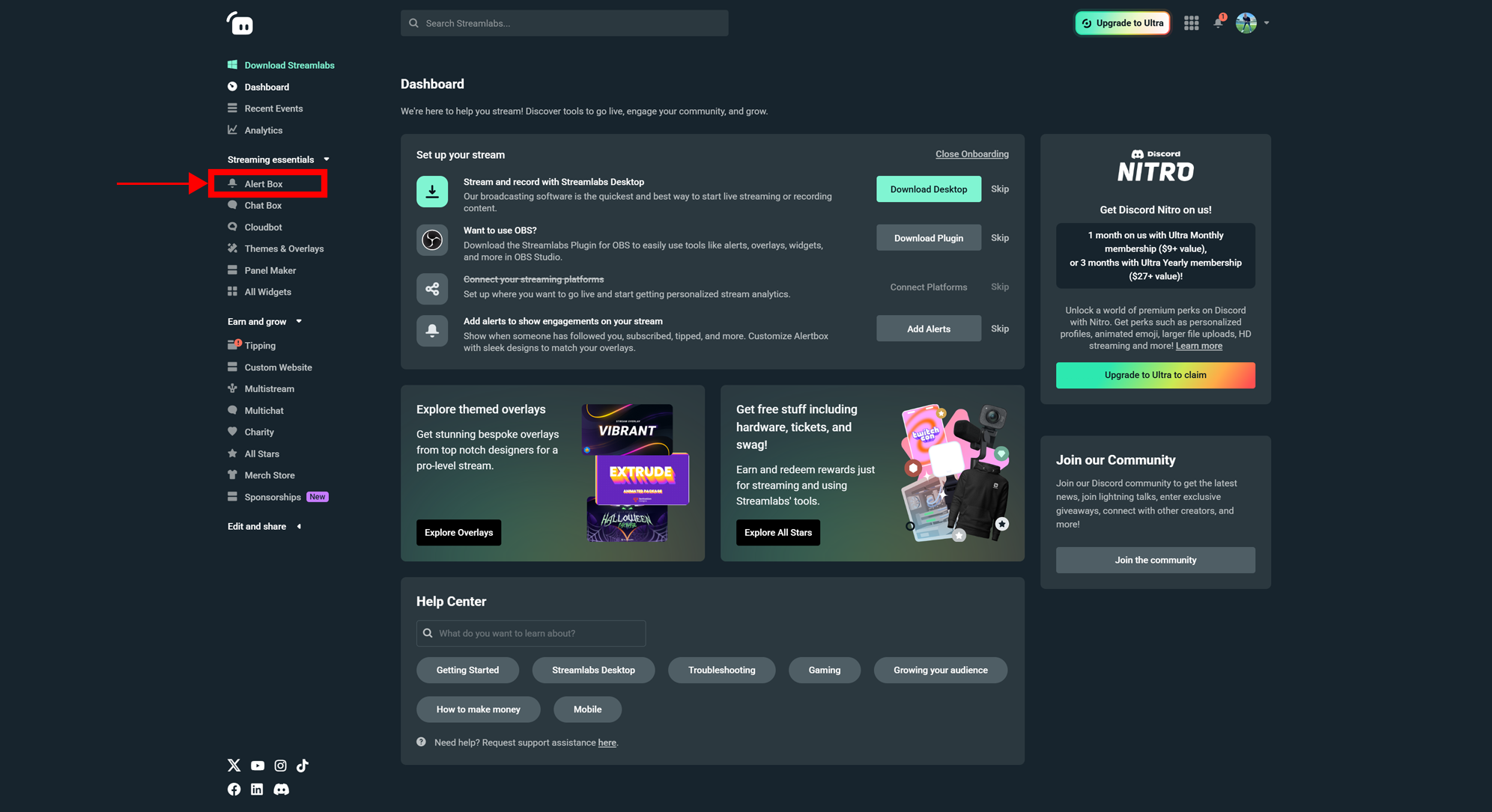 Once you are logged into Streamlabs, you will see the following dashboard: