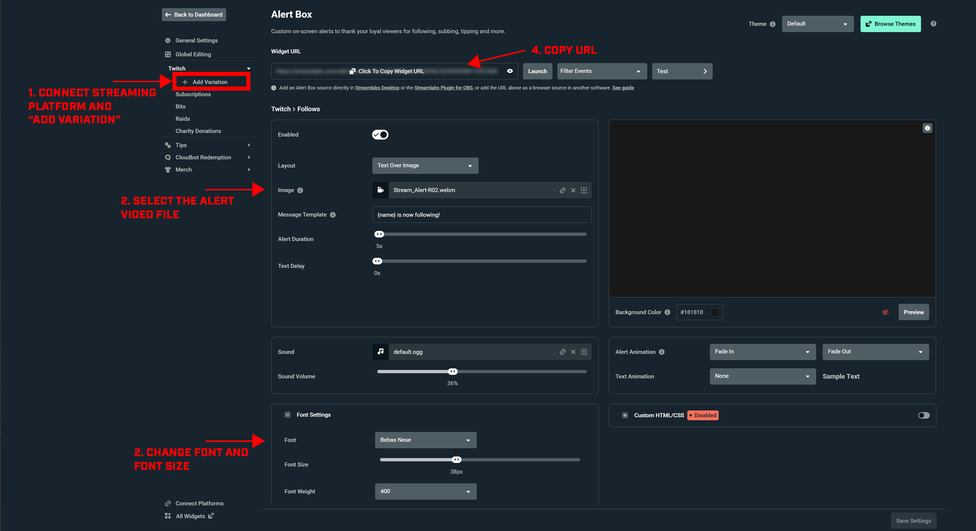 We recommend setting up a “New Follower” alert first. To do this, simply navigate to the left menu and select “Alert Box,” and then select “Add Variation.”