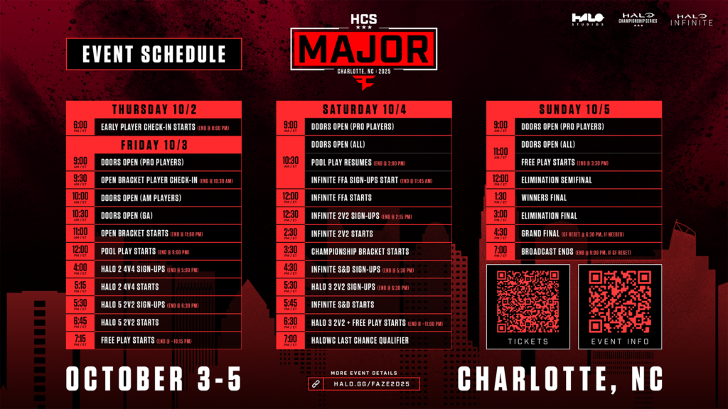 Date: October 3-5 Location: Charlotte, NC Venue: Charlotte Convention Center | GA Tickets: AVAILABLE NOW Team Passes: SALES ENDED Watch: Twitch + YouTube | Infinite 4v4: $250,000 Infinite FFA: $5,000 Side Tournaments: $5,500 |