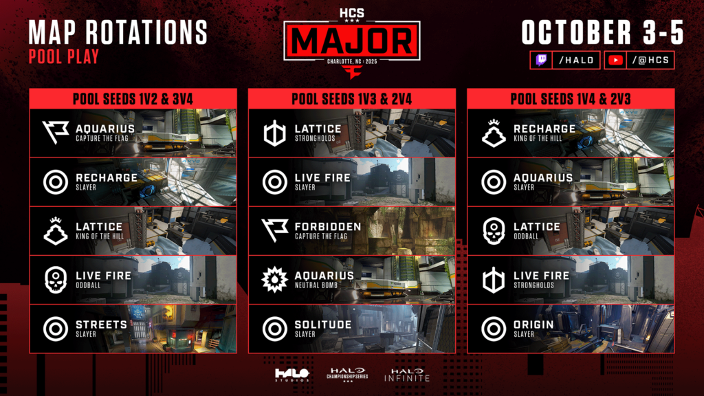 Elim. Round 5 Strongholds Lattice Slayer Recharge CTF Aquarius | Elim. Round 6 KOTH Live Fire Slayer Solitude Oddball Recharge | Elim. Quarters CTF Fortress Slayer Live Fire Bomb Aquarius Strongholds Lattice Slayer Streets | Elim. Semi-Finals Oddball Live Fire Slayer Recharge KOTH Lattice CTF Forbidden Slayer Origin |