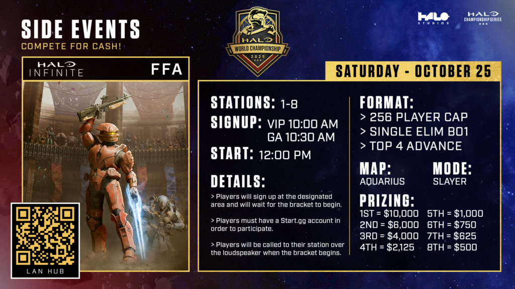 | Will there be a Free-For-All (FFA) competition at this event? | Yes! The event will feature a free-to-enter Halo Infinite FFA tournament, which will be open for up to 512 players and spectators. Best of luck to those competing for their share of $25,000! Must have a Spectator ticket to participate. Registration will take place on site! |