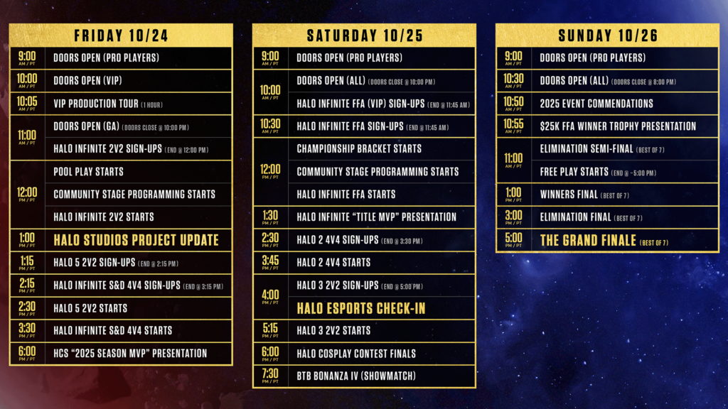 | Halo Infinite - FFA - Prize Pool: $25,000 - Player Cap: 256 - Registration: (VIPs 10a, GA 10:30a PT) End at 11:45a - Start: 12:00p PT | Halo 2 MCC - 4v4 - Prize: 1st/$1,050, 2nd/$450 - Team Cap: 16 - Registration: 2:30-3:30p PT - Start: 3:45p PT | Halo 3 MCC- 2v2 - Prize: 1st/$700, 2nd/$300 - Team Cap: 16 - Registration: 4-5p PT - Start: 5:15p PT |