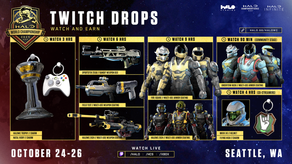 Joining us live in Seattle? Don't worry, attendees will pick up a Code Card at check-in that grants ALL HaloWC Twitch Drops, including the In-person Exclusive HaloWC Ring and Natal Clear charms!